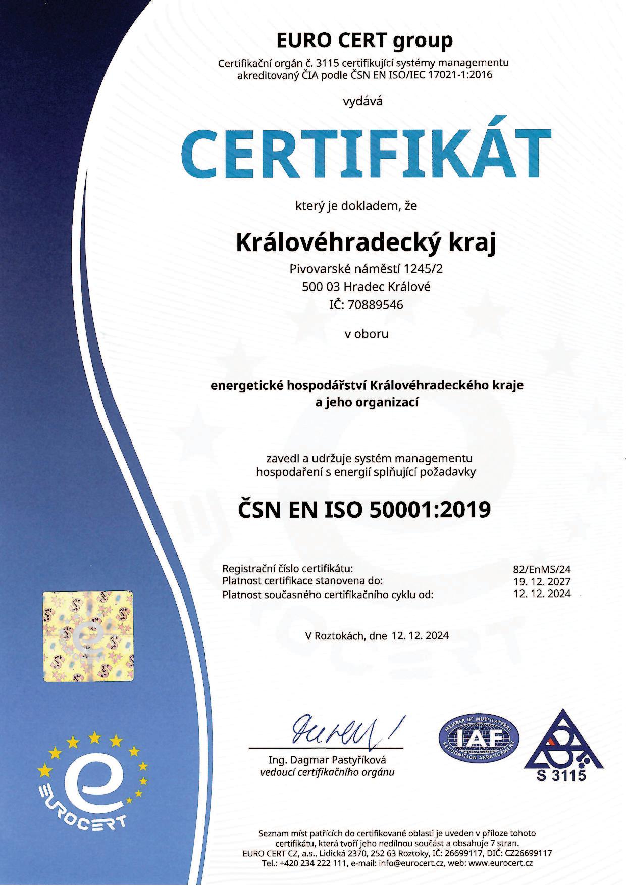 Ceertifikát KHK - energetické hospodářství Královéhradeckého kraje a jeho organizací - ČSN EN ISO 50001:2019